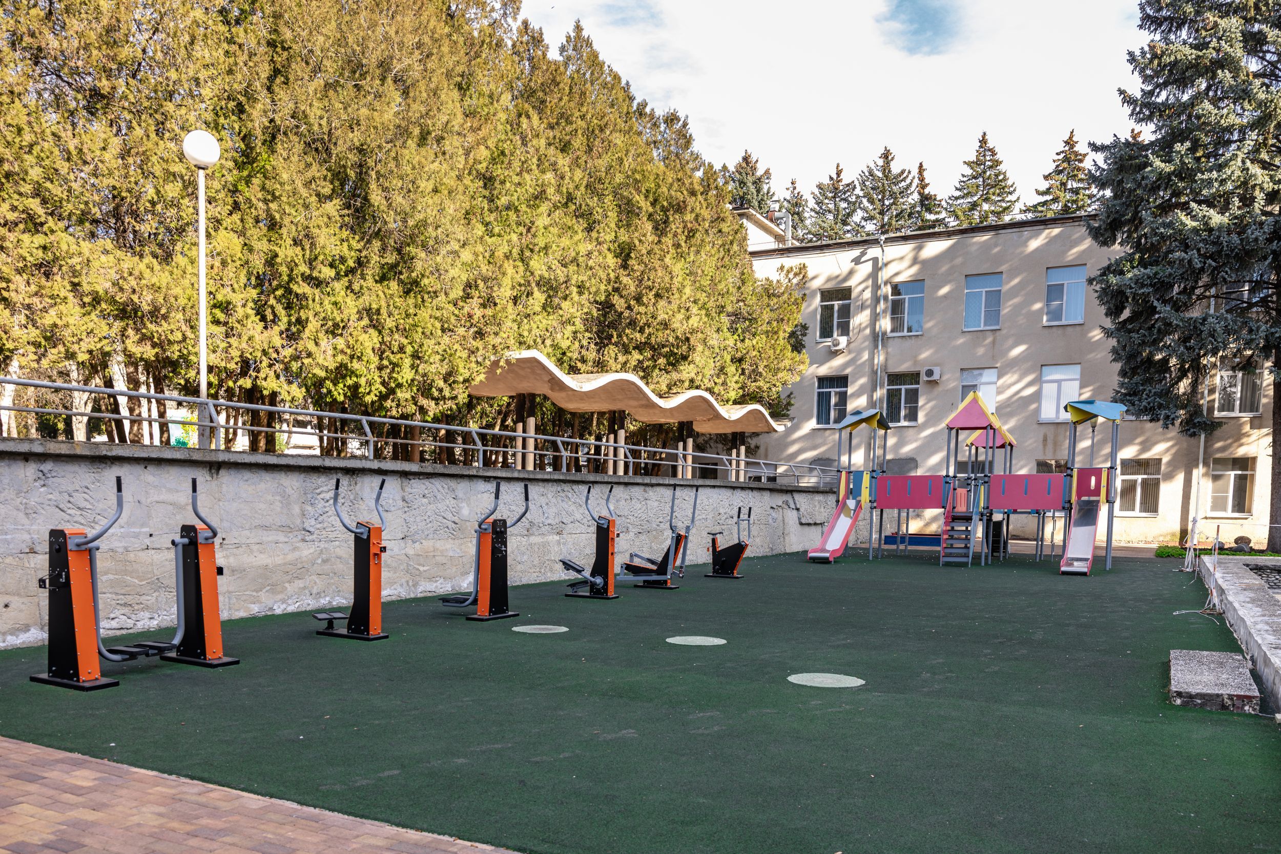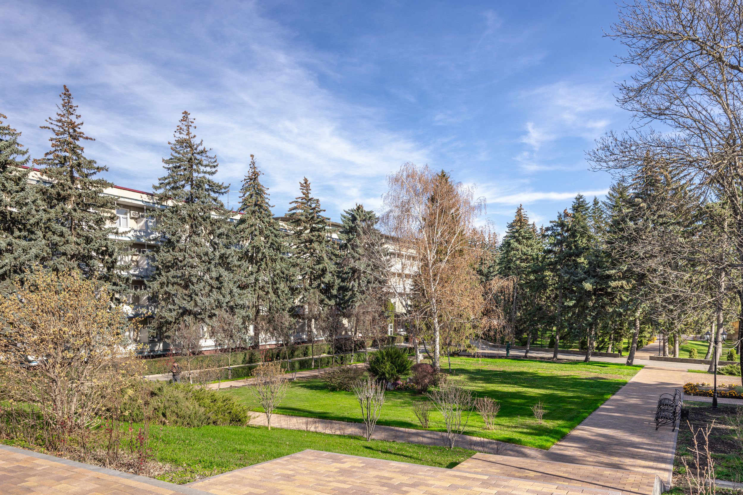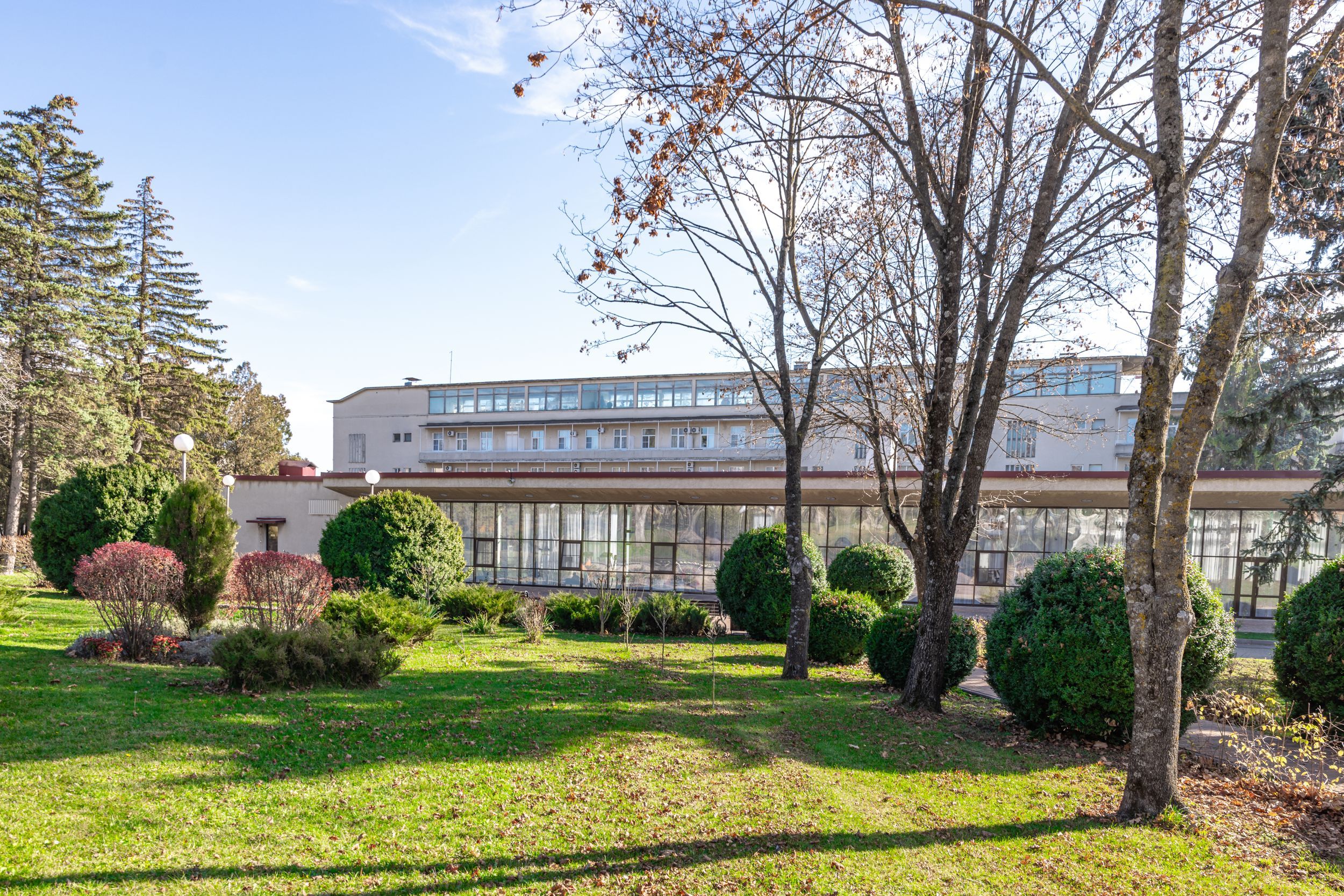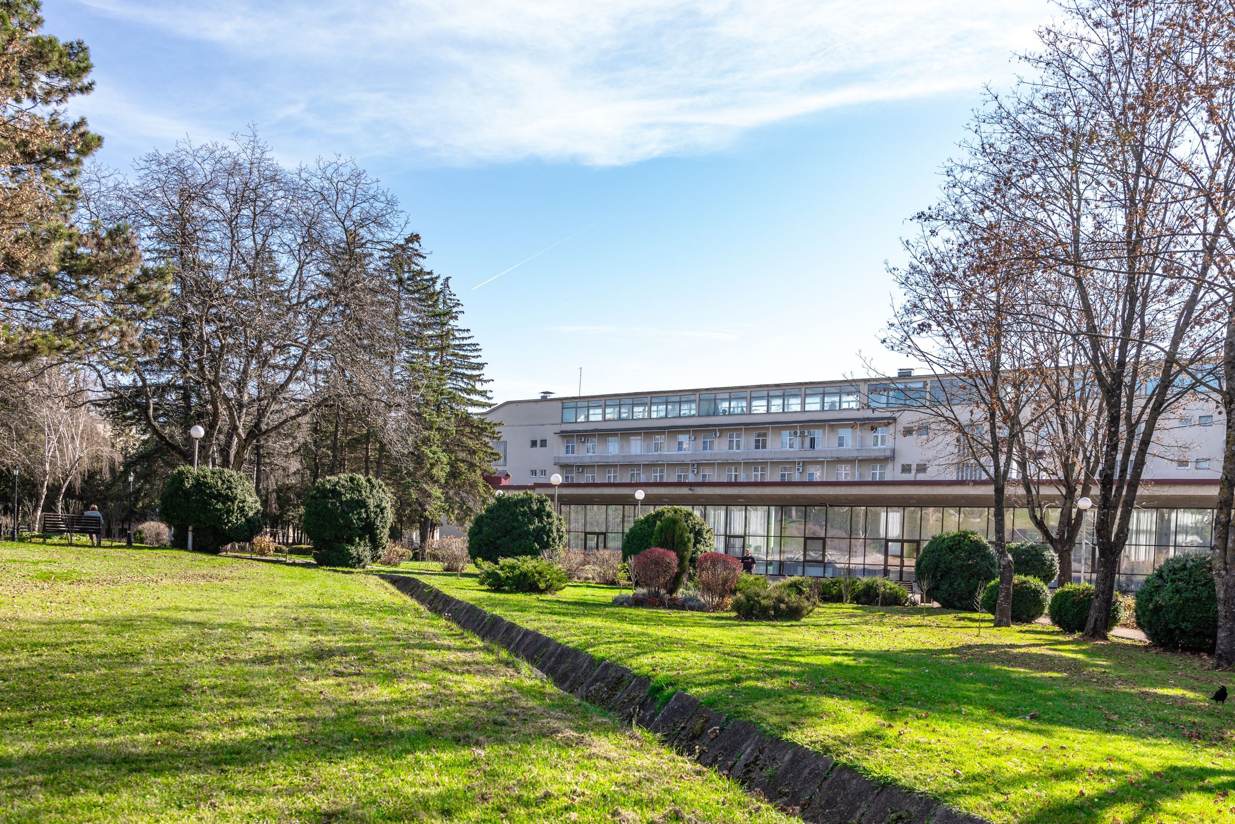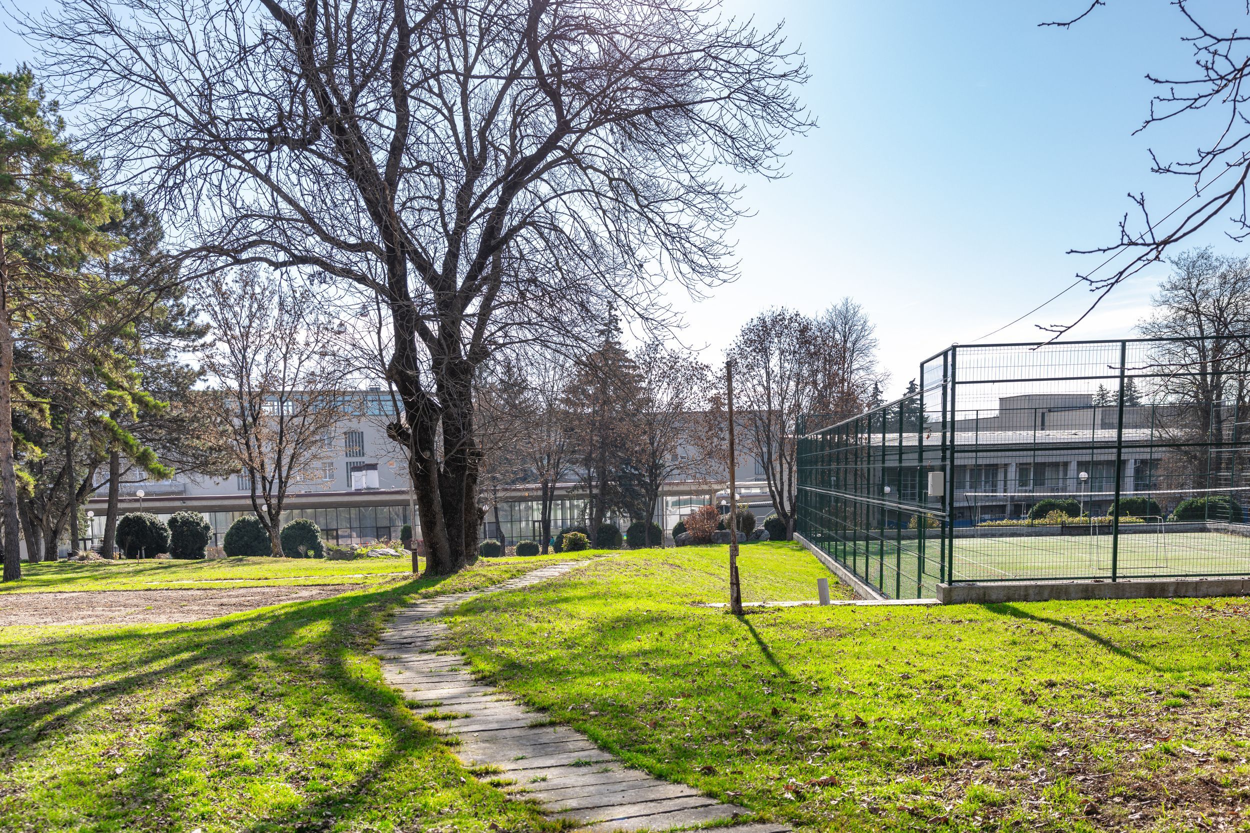 Территория санатория площадью 7 гектаров представляет собой ухоженный парк с удобной инфраструктурой. Все корпуса соединены теплыми переходами, что обеспечивает комфортное перемещение в любую погоду.