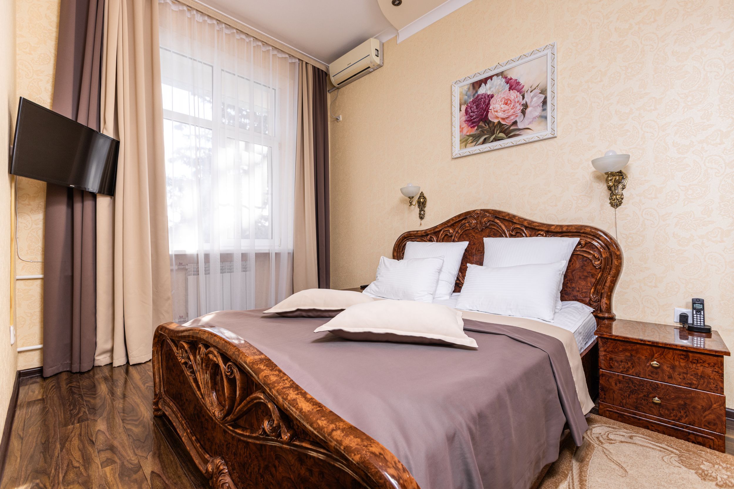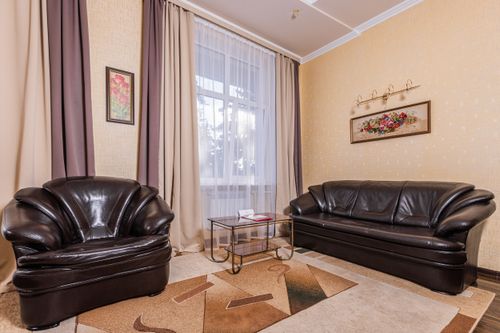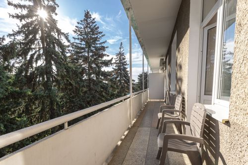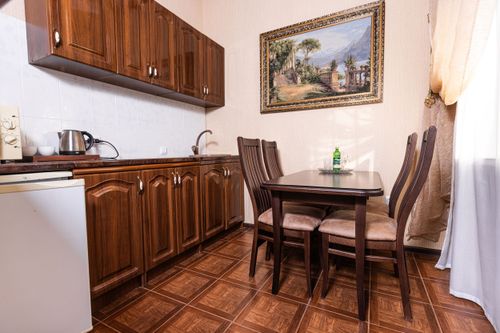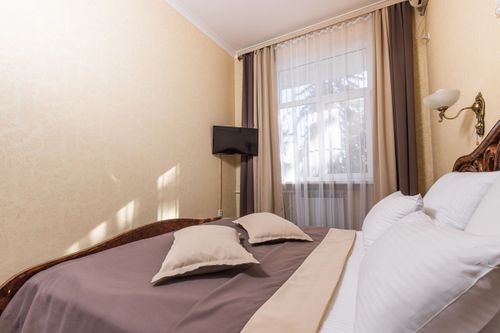 В номере вас ждут современная сплит-система, LED-телевизор, мини-холодильник, электрочайник и полный набор посуды. С балкона открывается спокойный вид на парковую зону.